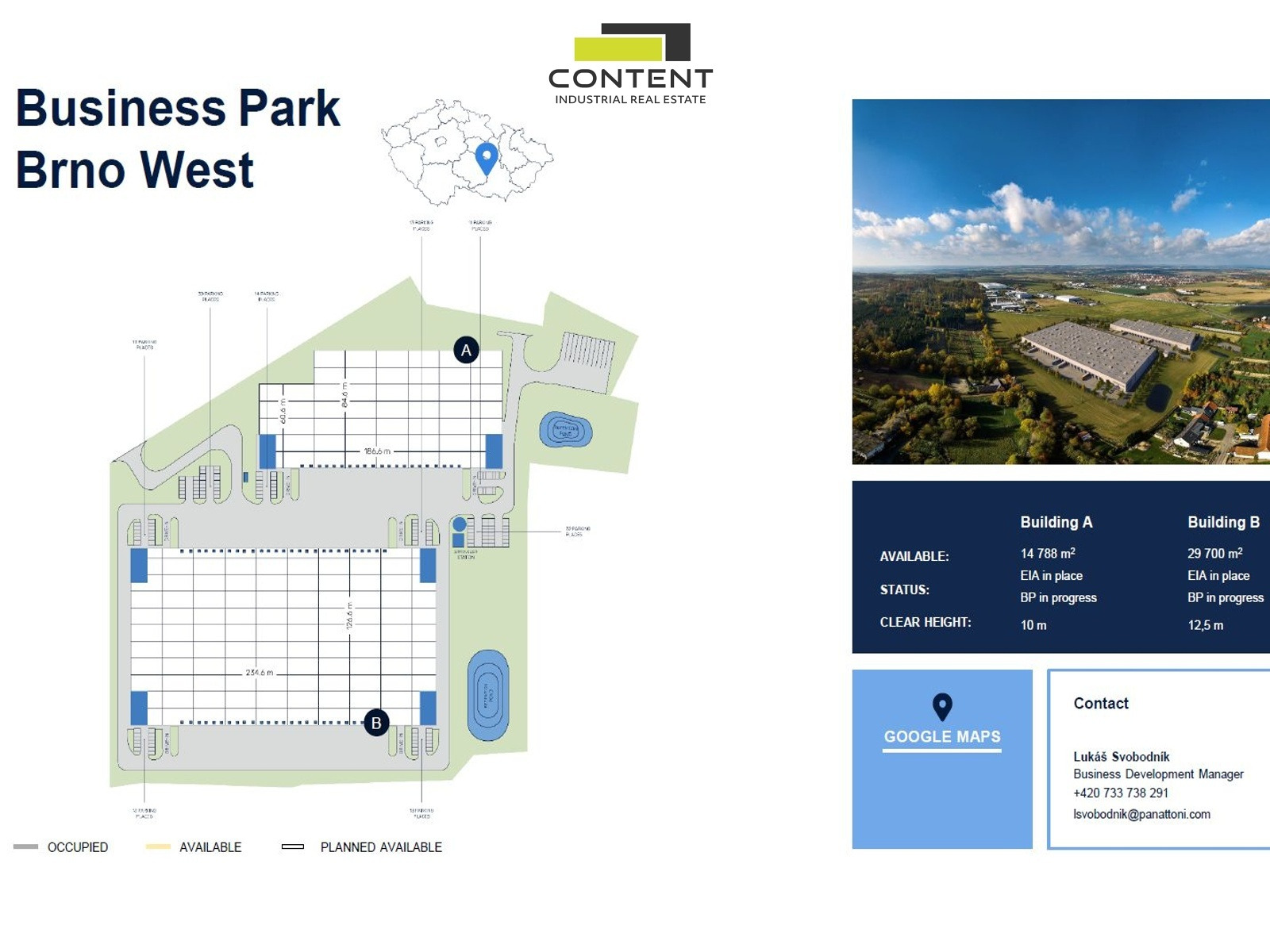 - budova k výstavbě 14.788 m² (budova A), dostupnost dohodou