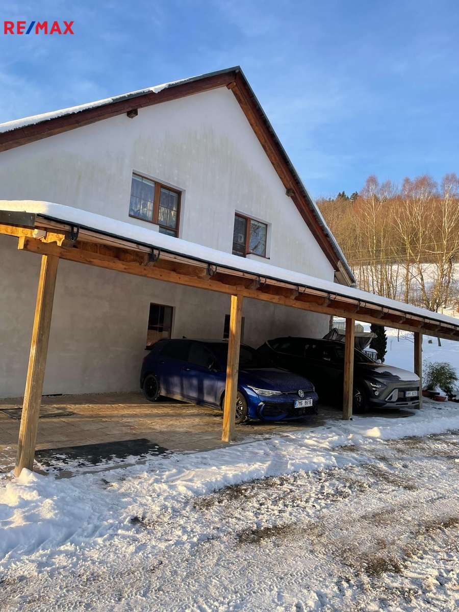 Rozsáhlý pozemek o celkové výměře 4 293 m² poskytuje dostatek soukromí i prostoru pro další rozvoj. Parkování je zajištěno až pro 8 vozidel – tři na krytém stání a další na venkovních plochách. Nemovitost je napojena na veškeré inženýrské sítě – veřejnou kanalizaci, plyn, elektřinu, obecní vodu a vlastní studnu.