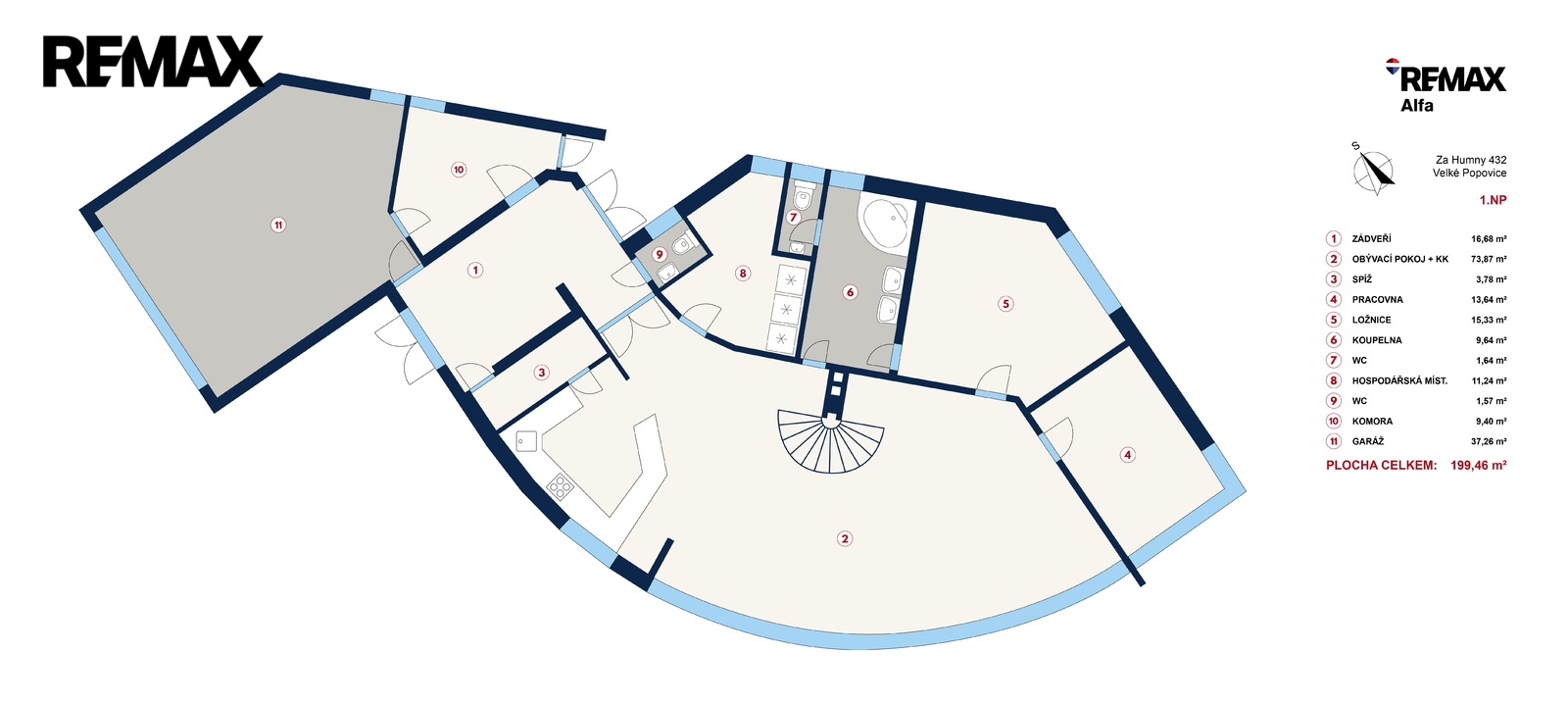 • velkorysý obývací prostor s krbem (cca 73 m²)
