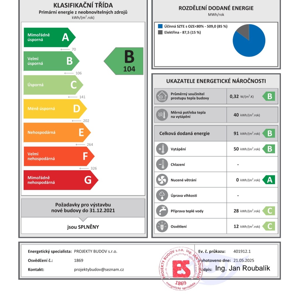 - Ukazatel energetické náročnosti budovy: 104 kWh/m²