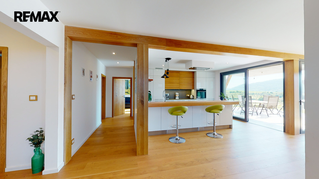 Dům byl zkolaudován v roce 2019 a je zhotoven ve vysokém nadstandardu, zahrnující kompletně vybavenou kuchyňskou linku s keramickou deskou ( spotřebiče AEG + Whirlpool ), v hodnotě 600 000,-Kč, dubové podlahy, schody, obklady, parapety, dveře, sanita značky Villeroy & Boch. V dětských pokojích, ložnici a šatně jsou instalované vestavěné skříně, v každém pokoji je vyvedena kabelová přípojka internetu, dále příprava na zabezpečovací zařízení, centrální vysavač a krb (zkolaudovaný komín). V domě je potřeba dokončit horní koupelnu, dále je realizována příprava ( kastlíky a elektrorozvody, ovládané přes tablet ) na vnější žaluzie, které stačí dokoupit a nainstalovat.