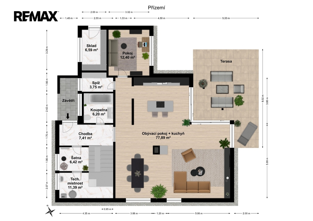 1NP: Chodba 7,5 m2, koupelna + WC 6,2 m2, spíž 3,75 m2, sklad 6,5 m2, pokoj 12,5 m2, obývací pokoj, s kuchyňským koutem 78 m2 a vstupem na terasu o výměře 25 m2, technická místnost 11,5 m2, šatna 6,5 m2.