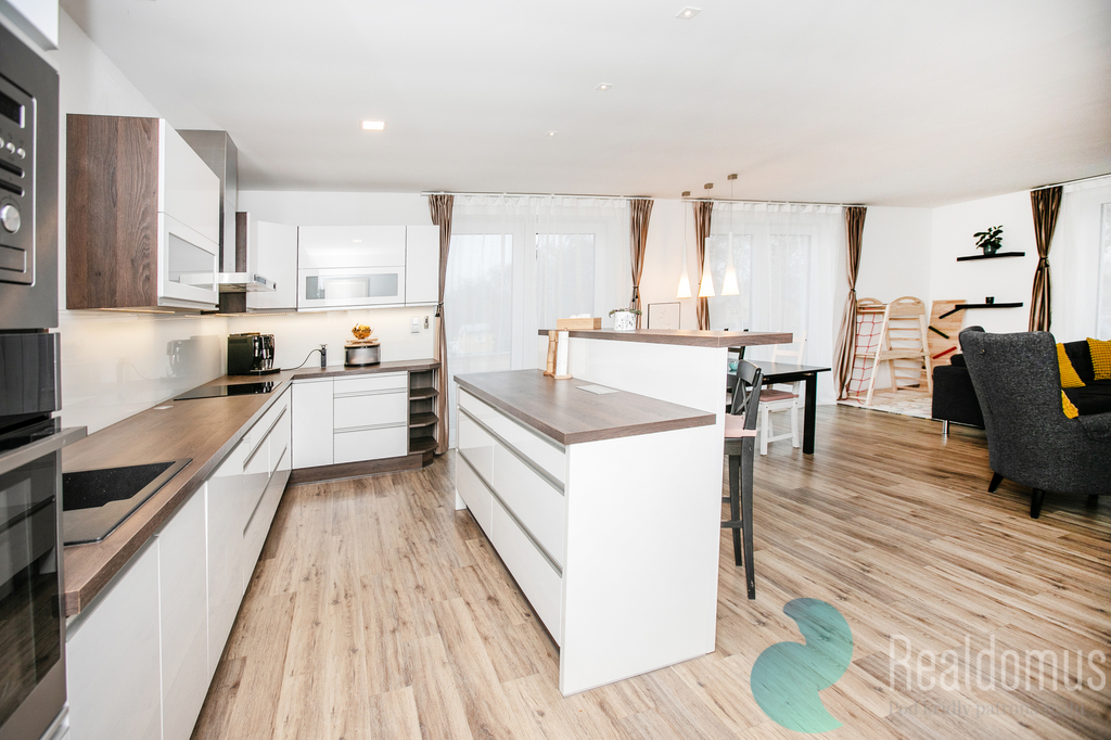 Hned po vstupu do zádveří odložíte kabáty a boty a projdete do chodby s praktickým samostatným WC. Srdcem domu je světlý obývací pokoj s moderní, plně vybavenou kuchyní, kde se bude odehrávat většina rodinných chvil. V zimě doplní atmosféru krbová kamna, v létě si vychutnáte kávu nebo grilování na terase (35m²) s výhledem do rozlehlé zahrady. u terasy s markýzou na ovládání se nachází skalka s jezírkem.