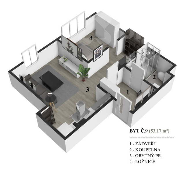 - Celková podlahová plocha: 53 m²