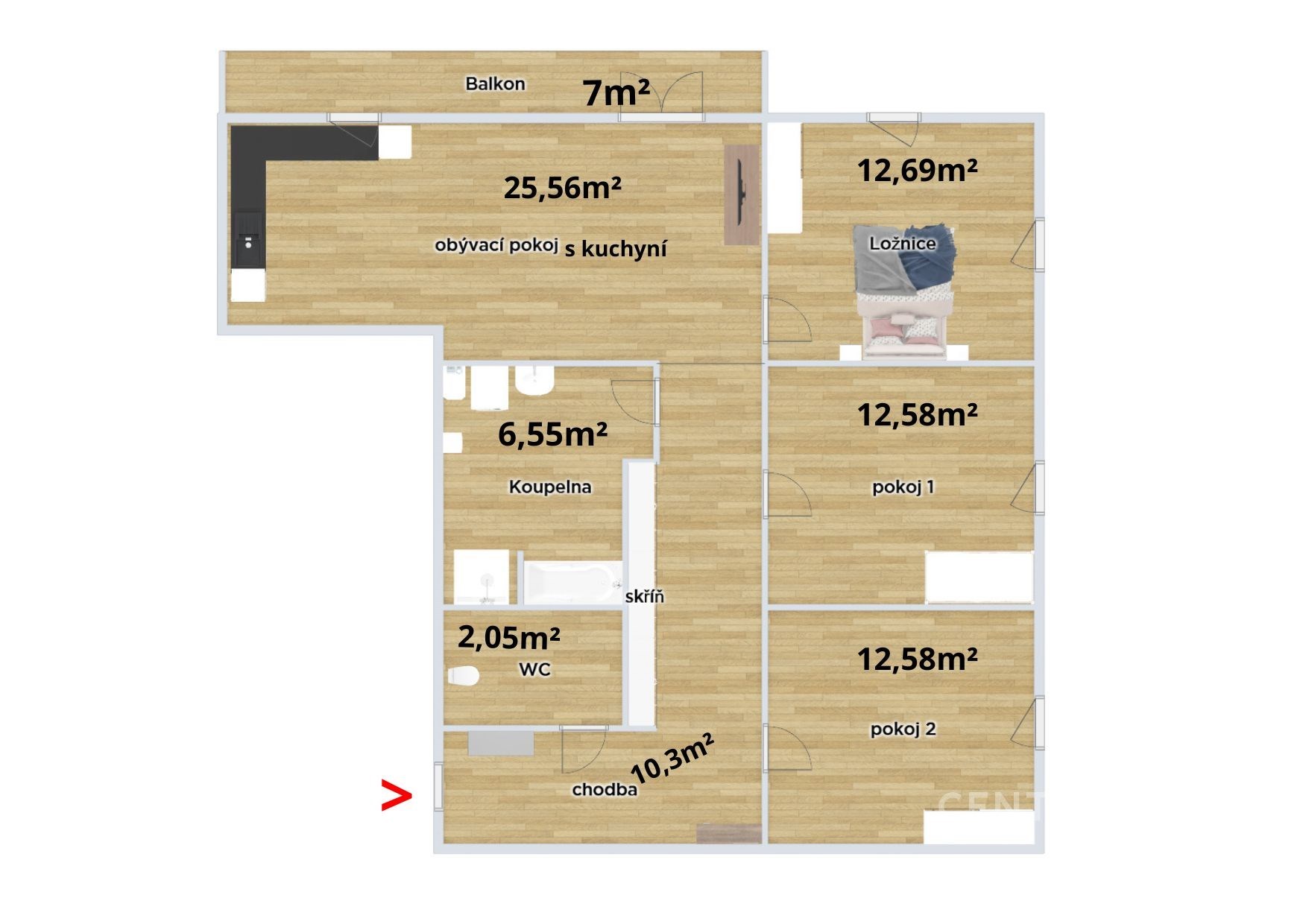 Kuchyň je plně vybavena kuchyňskou linkou s plynovým sporákem, elektrickou troubou, digestoří, lednicí i myčkou. Přímo z obývacího pokoje se vychází na balkon o velikosti 7 m² s markýzou, kde si můžete vychutnat čerstvý vzduch a chvíle klidu. Do ostatních pokojů pak svítí slunce odpoledne, což dodává bytu teplo a světlo po celý den.