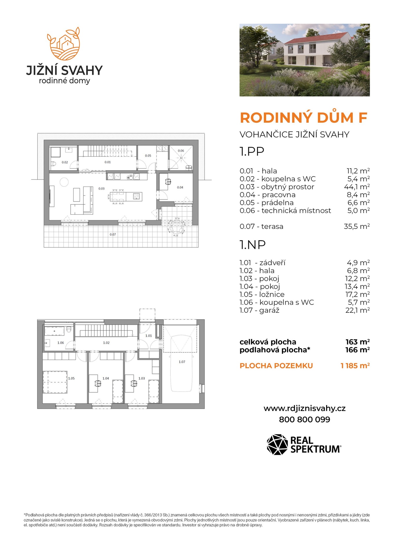 1.PP: hala (11,2 m²), obývací pokoj s kuchyní (44,1 m²), pracovna (8,4 m²), terasa (35,5 m²), koupelna s WC (5,4 m²), prádelna (6,6 m²), technická místnost (5,0 m²)