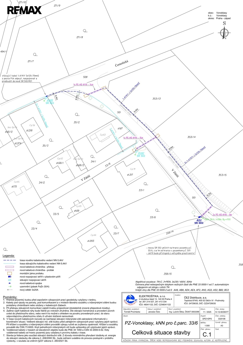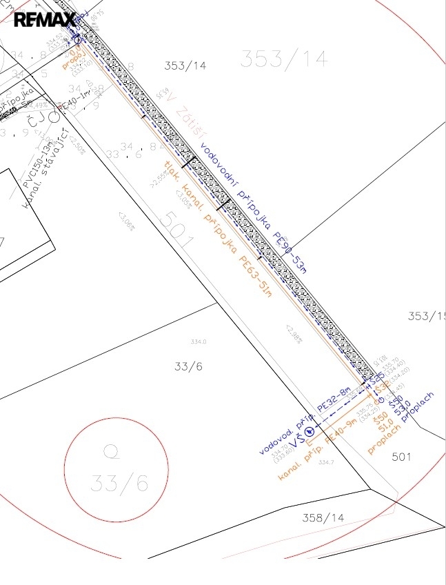 V rámci inženýrských sítí je již řešeno připojení elektřiny – byla podána žádost u ČEZ a do konce roku 2026 se počítá s připojením včetně vybudování pilíře na hranici pozemku. Pozemek je tedy prodáván jako připojený na elektřinu a náklady přípojky elektřiny jsou zahrnuty v ceně pozemku. Voda a kanalizace jsou aktuálně v řešení – existuje situační návrh napojení a probíhá komunikace s obcí ohledně finálního schválení. Samotnou vodovodní a kanalizační přípojku si vybuduje nový majitel na vlastní náklady.