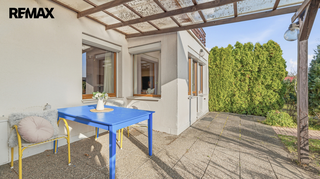 Na obytnou část navazuje prostorná terasa orientovaná do zahrady, která nabízí ideální místo pro ranní kávu, letní posezení i rodinná setkání.