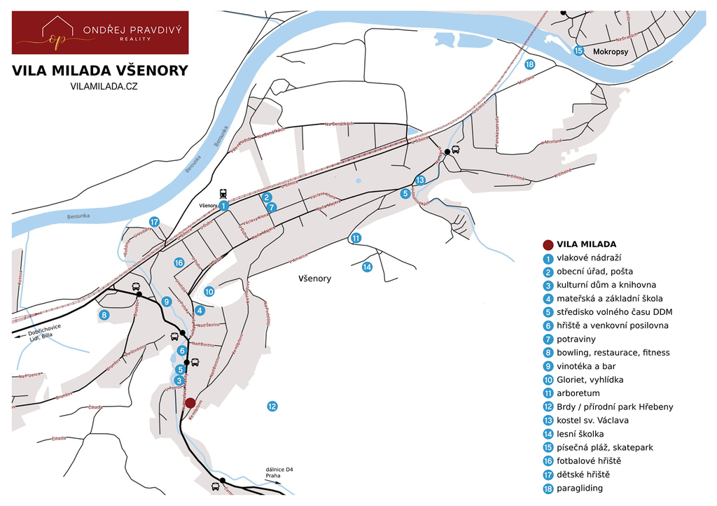 V okolí se nachází krásné lesy a přírodní rezervace, které nabízejí možnosti pro procházky, cykloturistiku či různé sportovní aktivity. V blízkosti nemovitosti je zastávka autobusu a ani k vlakovému nádraží to není daleko. Vlakem se dostanete za 20 min na Smíchovské nádraží či do 30 min na Hlavní nádraží. Autem jste za pouhé 3 minuty na Strakonické dálnici D4 a odtud za chvíli na dálničním obchvatu či na kraji Prahy.