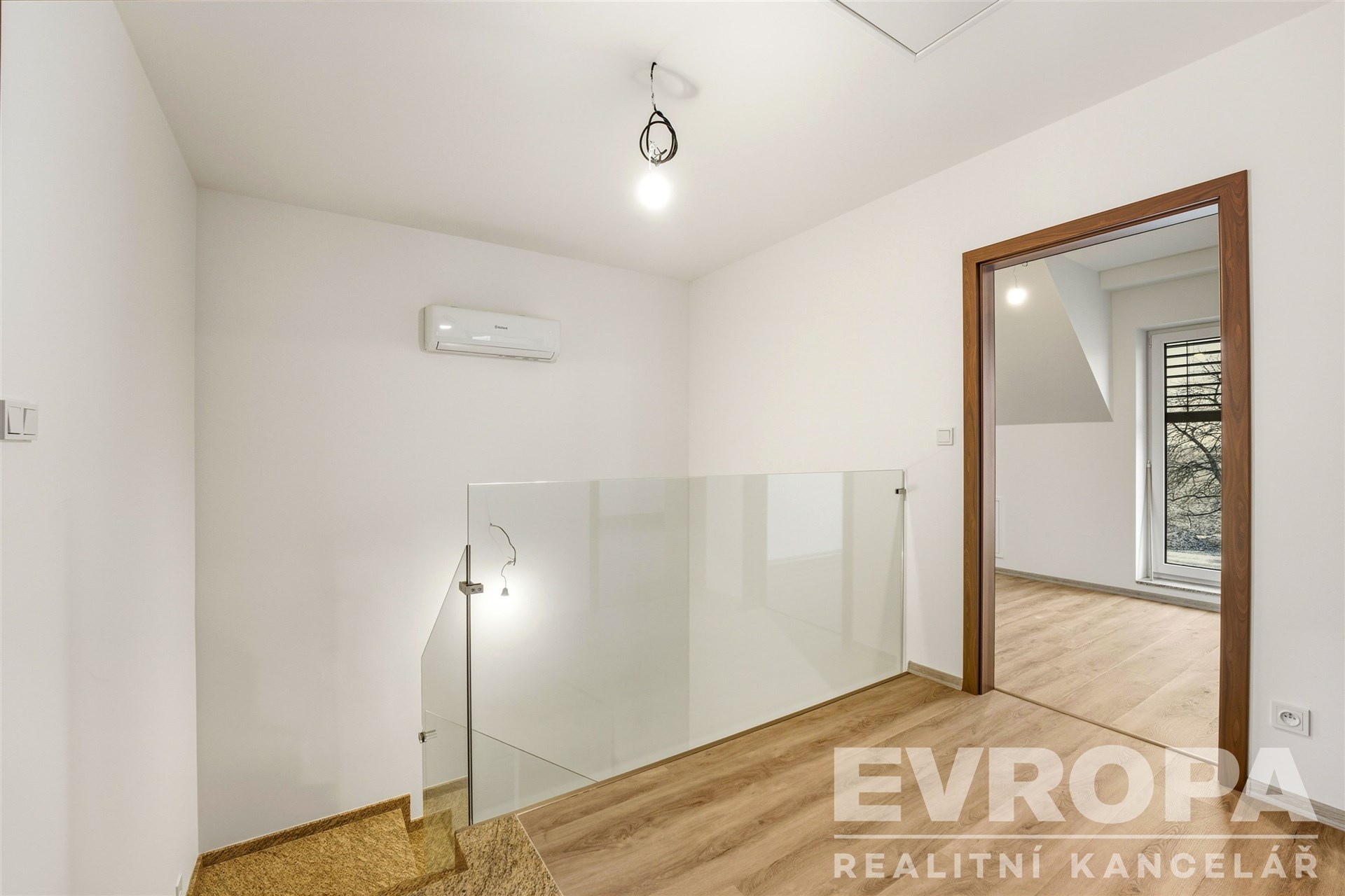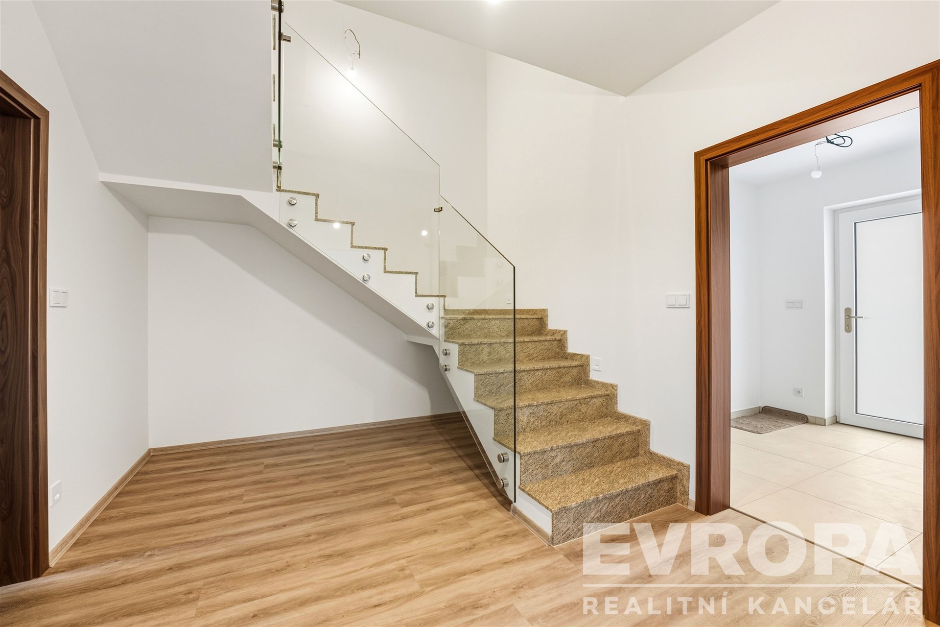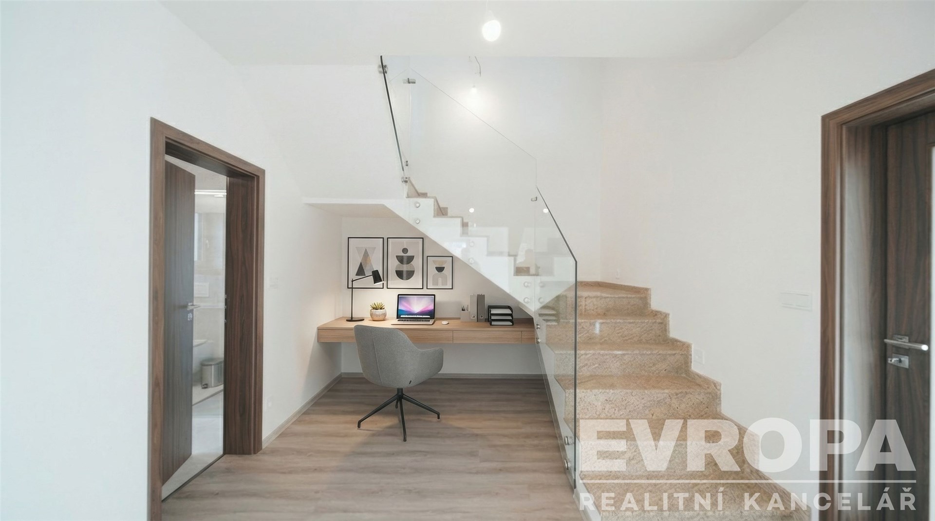 Dominantou prostorné chodby je betonové schodiště v mramoru opatřené moderním skleněným zábradlím a osvětlením schodišťových nášlapů na pohybový a světelný senzor. Pod schodištěm je veliký prostor, který nabízí další praktické využití.