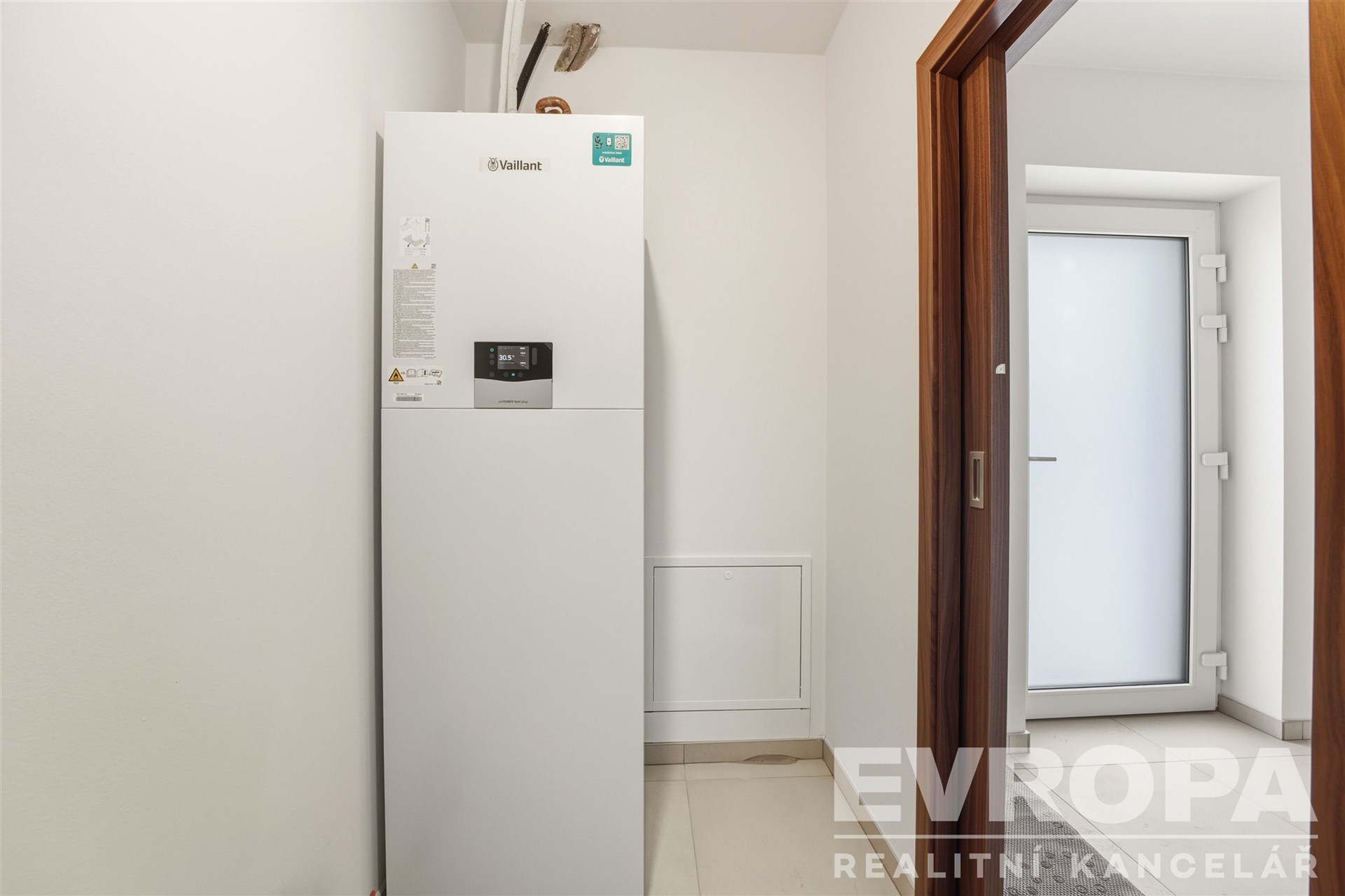 V přízemí se nachází zádveří a technická místnost s tepelkem, přípojkami pro pračku a sušičku, vyvedená kabeláž pro připojení fotovoltaiky a také praktická výlevka.