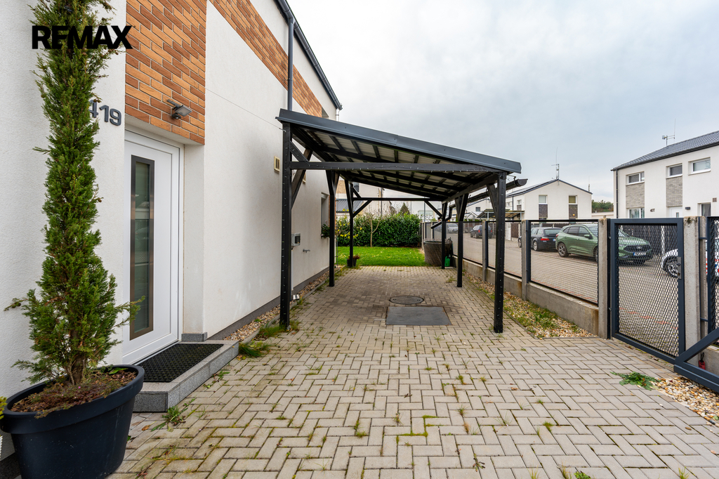 Dům je napojen na obecní vodu, elektřinu a tlakovou kanalizaci. Internet je řešen bezdrátově, plyn v lokalitě není. Parkování je komfortní — na vlastním pozemku lze zaparkovat 4 až 5 vozidel, další místa jsou k dispozici před domem. Orientace domu na východ, jih a západ zajišťuje dostatek světla po celý den. Součástí zahrady je také praktický zahradní domek, terasa, pergola a přístřešek na auta vč. dalšího úložného prostoru.