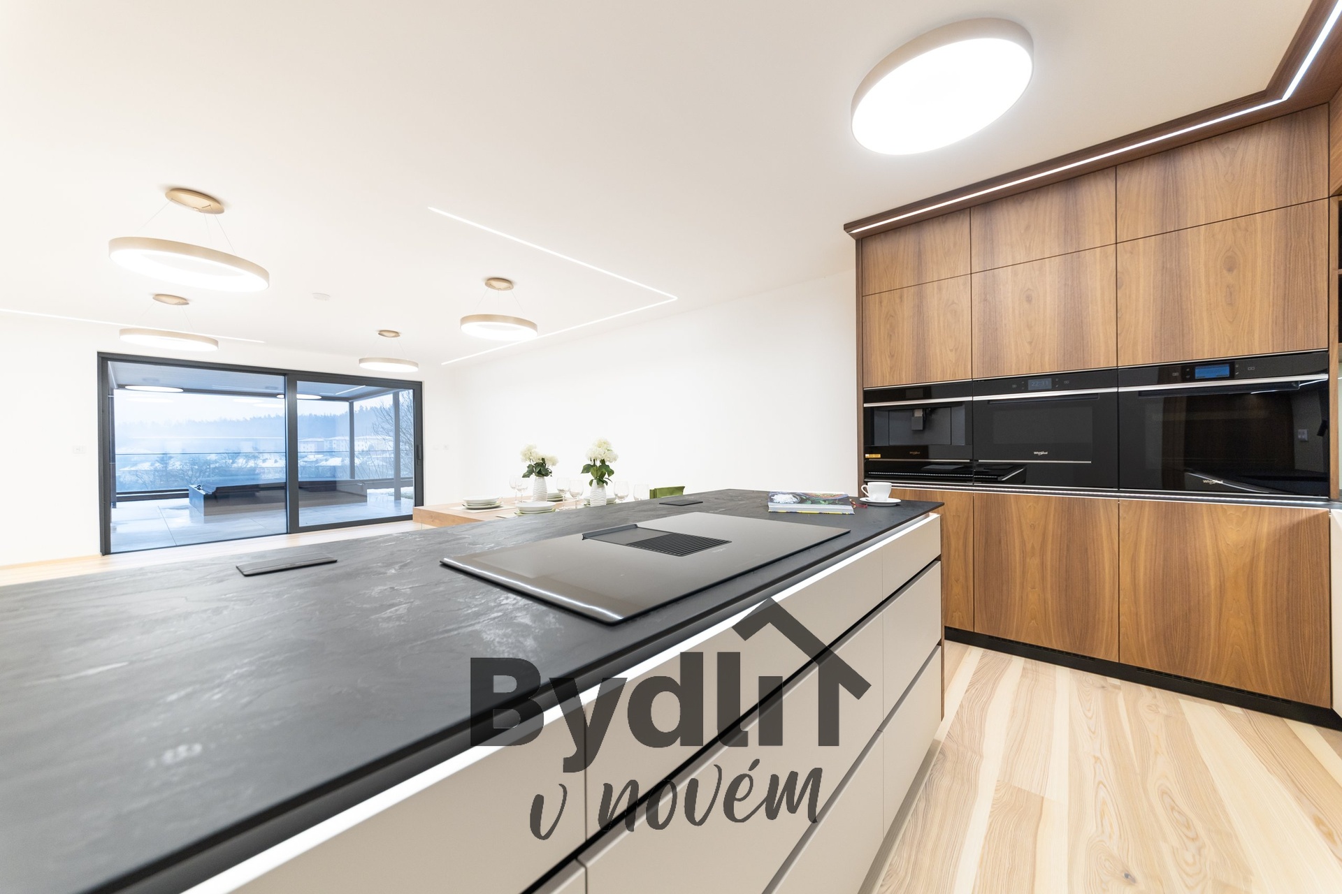 Kuchyňská linka s vestavěnými spotřebiči nejvyšší řady Whirlpool, včetně integrovaného kávovaru, výhřevných zásuvek a lednice o šířce 70cm. Součástí je praktický kuchyňský ostrůvek i designový jídelní stůl pro maximální komfort stolování a vaření.