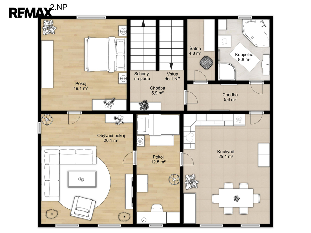 Druhé podlaží - 3+1 - celková podlahová plocha 102 m² po rekonstrukci