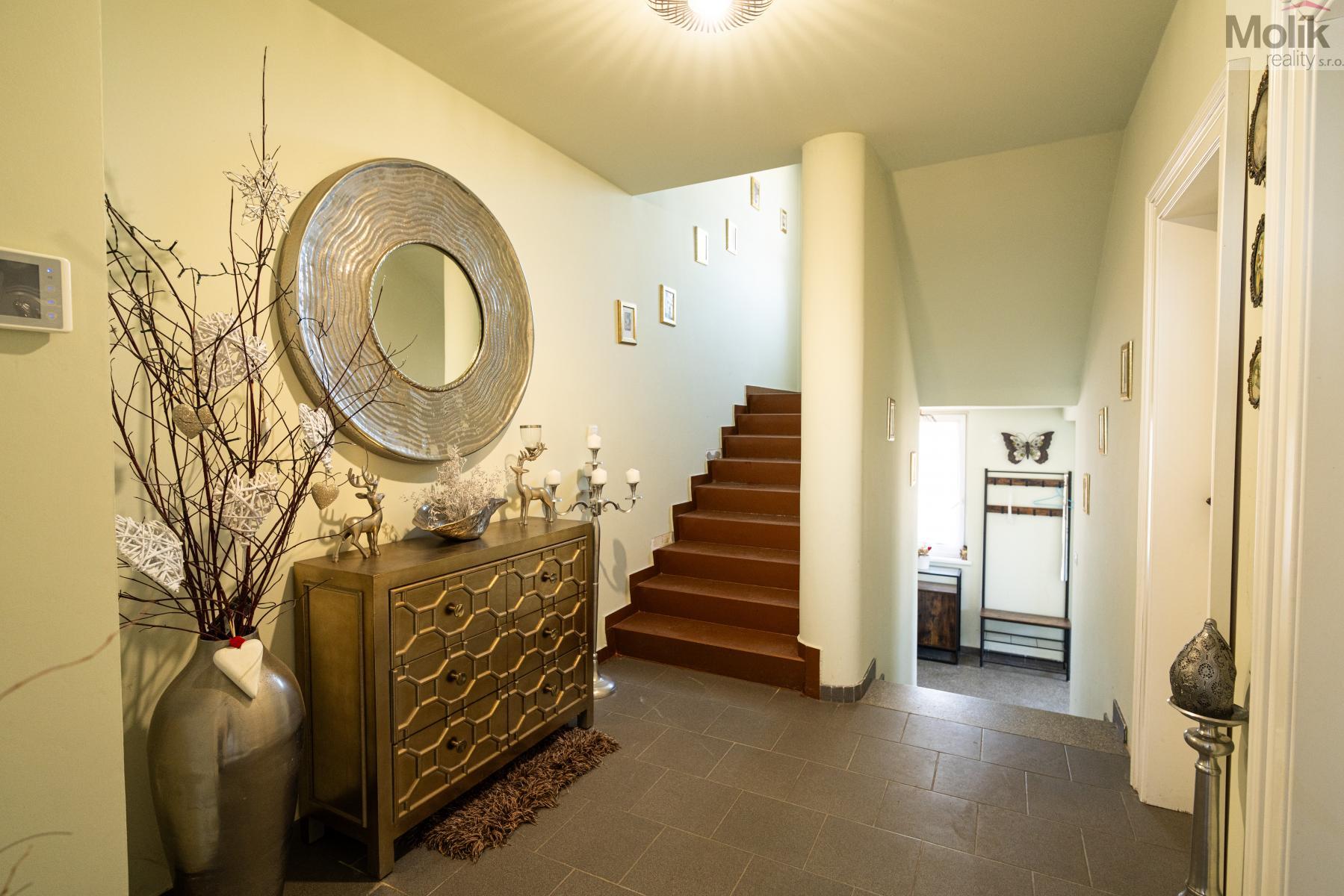 Výjimečné zázemí naleznete také v exteriéru. Na pozemku stojí prostorná vytápěná dvougaráž, která je podsklepená a ukrývá technické zázemí, včetně bazénové filtrace.