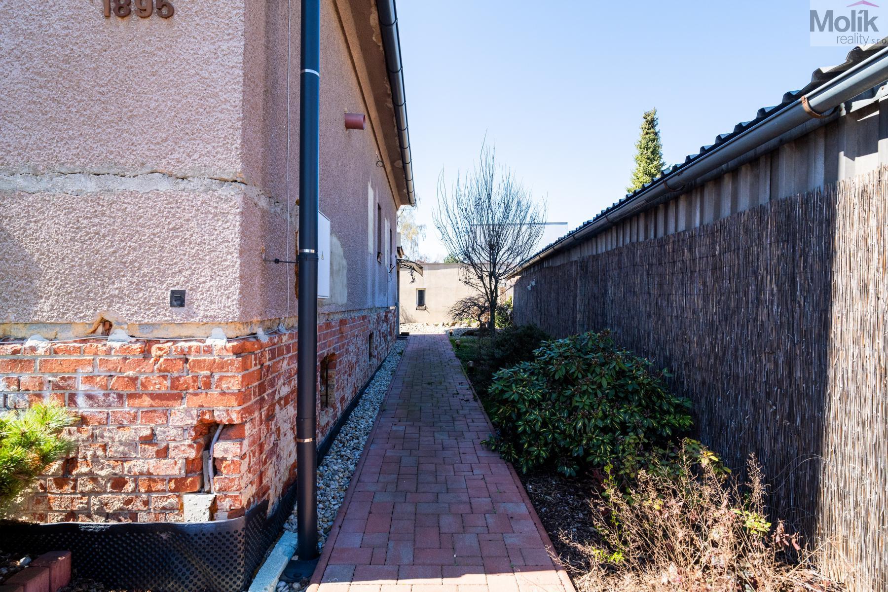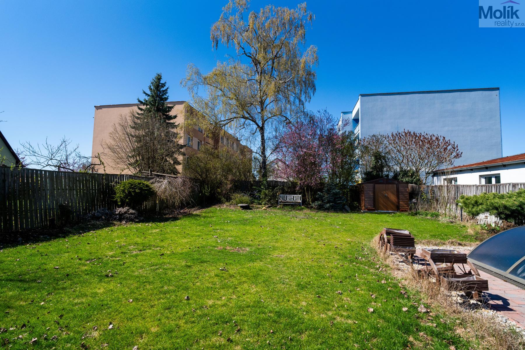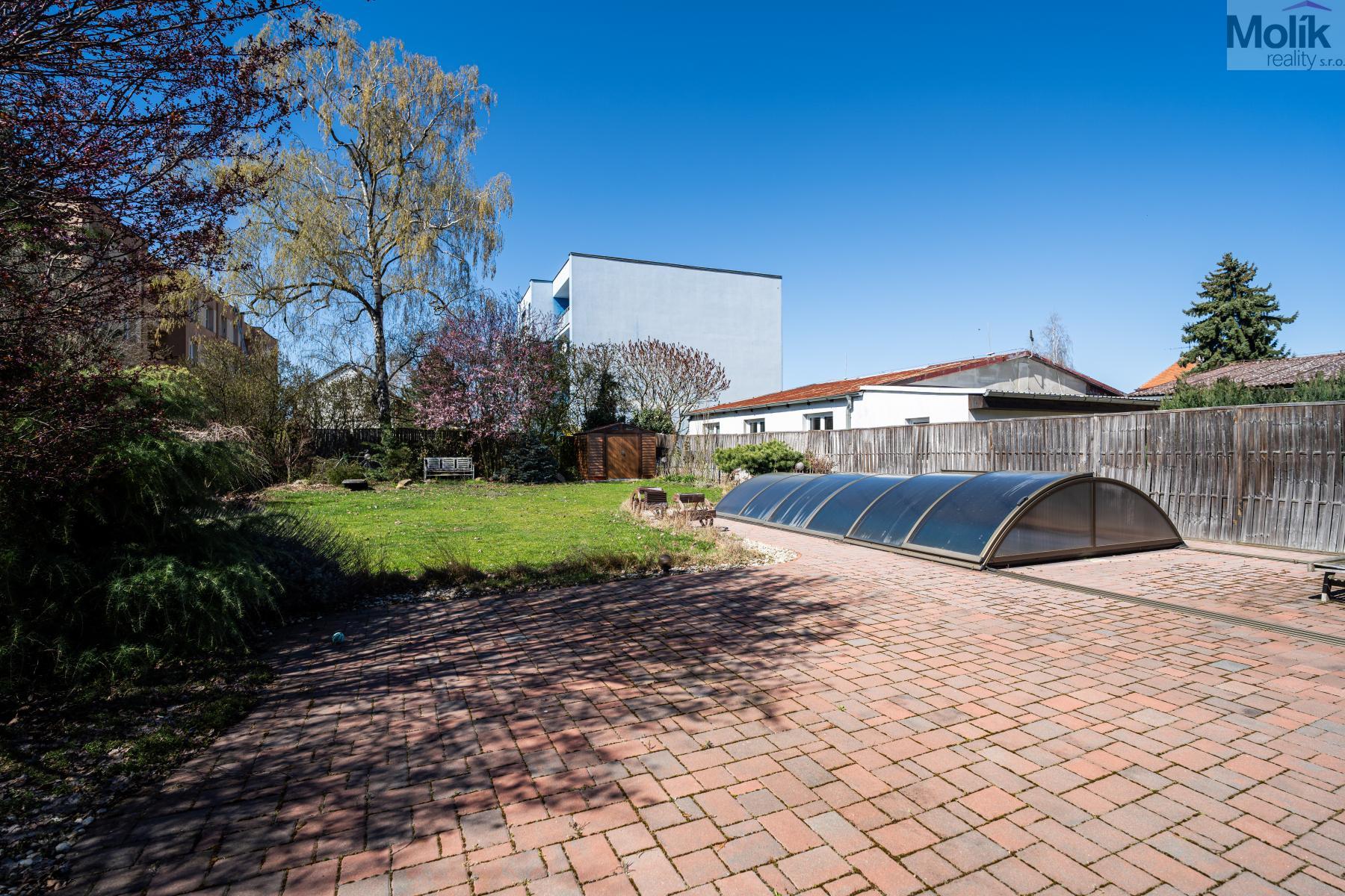 Zahrada je koncipována jako odpočinková zóna s okrasnými stromy, jezírkem a krytým bazénem, pozemek doplňuje také kůlna pro uložení zahradního vybavení. Zahrada je také vybavena automatickým závlahovým systémem a o sekání trávy se stará robotická sekačka. Tento dům představuje ideální spojení moderních technologií, poctivé rekonstrukce a klidného zázemí pro spokojený rodinný život.