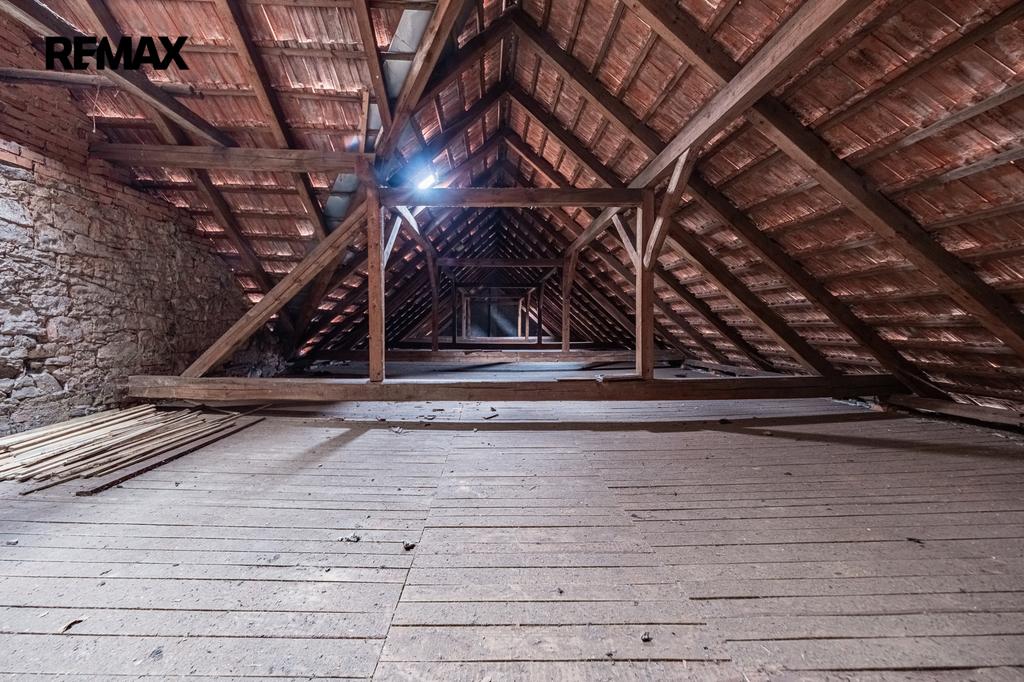 Podkroví domu je v současnosti určeno k rekonstrukci a nabízí velký potenciál pro vybudování nájemních bytů či ubytovacích kapacit.