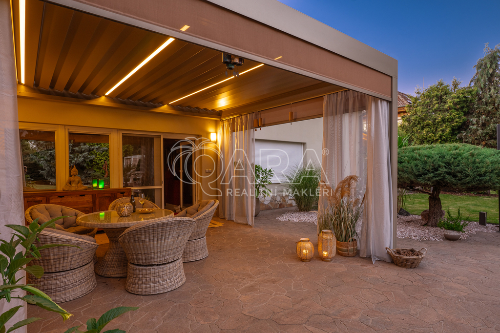Dům nabízí nadstandardní vybavení, dvě terasy, zimní zahradu, wellness se saunou, profi fitness, plavecké SwimSpa s protiproudem, bioklimatickou pergolu a luxusní kuchyň.