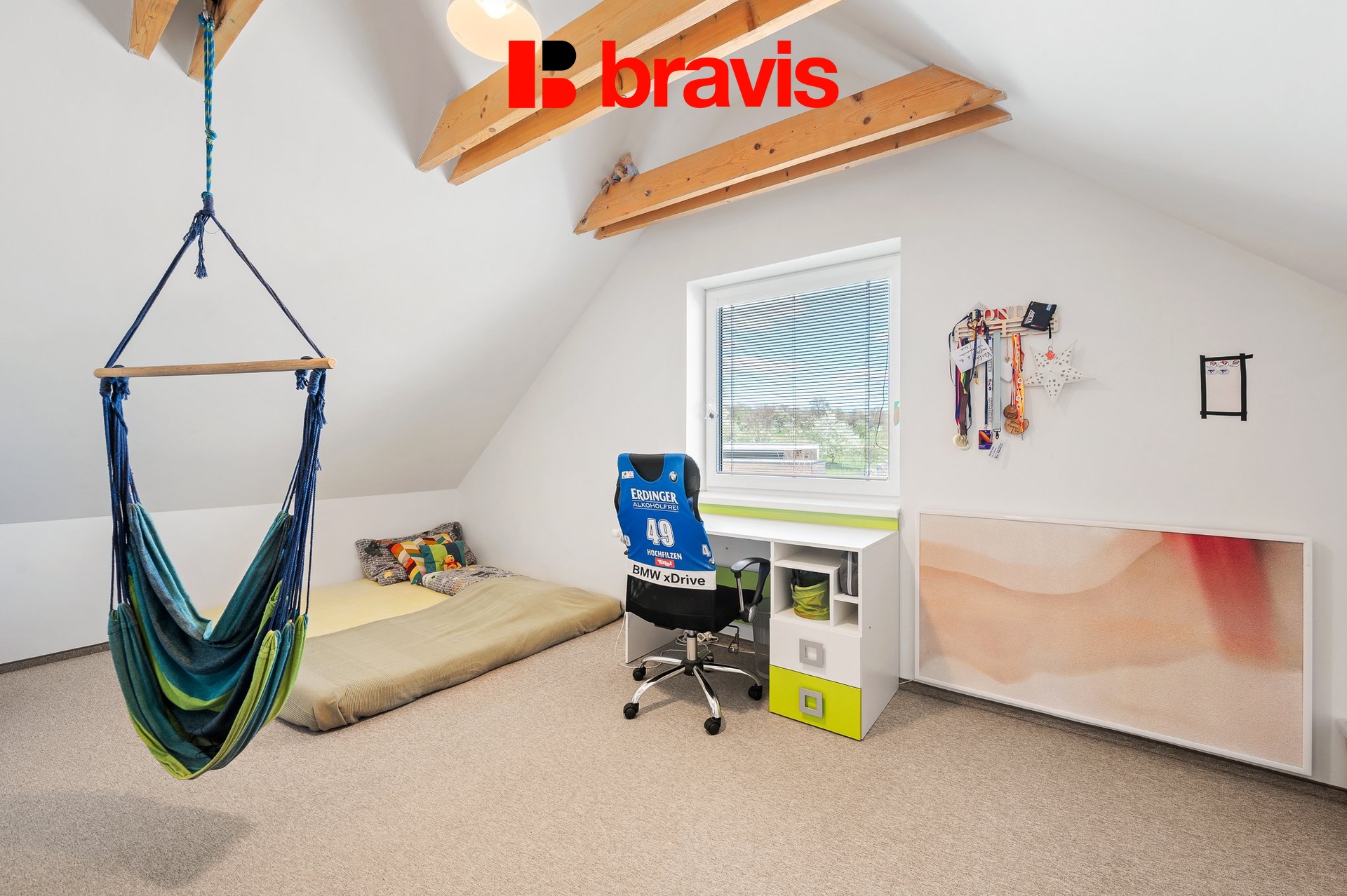 • Druhý pokoj (19,32) je vybaven nábytkem na míru, v současnosti navrženým pro dvě děti – s postelemi, úložnými prostory i pracovními místy. Jak s ním jeho noví majitelé naloží, bude záležet na nich.