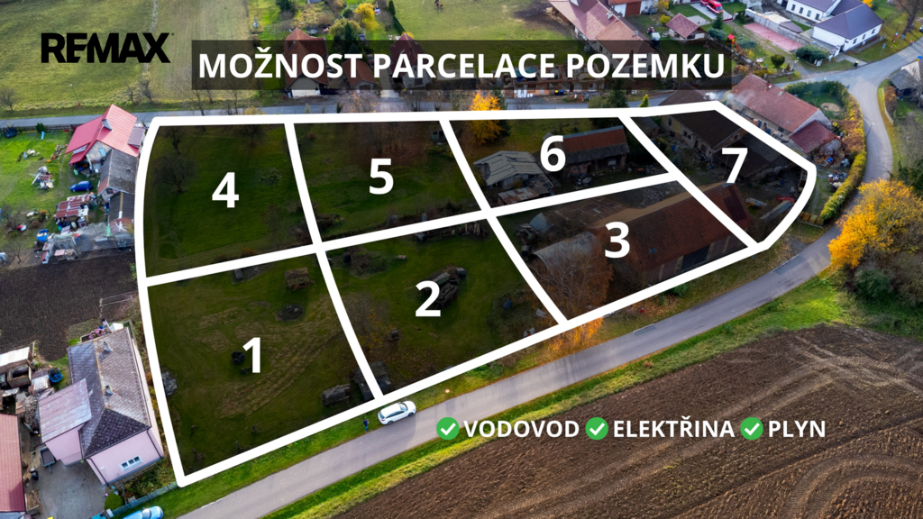 Pozemek je kompletně vedený jako stavební, má rozlohu 7 032 m² a nabízí skvělý investiční potenciál. V současnosti je využíván pro zemědělské účely, je však možné jej také rozdělit na několik samostatných stavebních parcel a ty následně prodat, nebo zhodnotit výstavbou rodinných domů, či jiným investičním záměrem.
