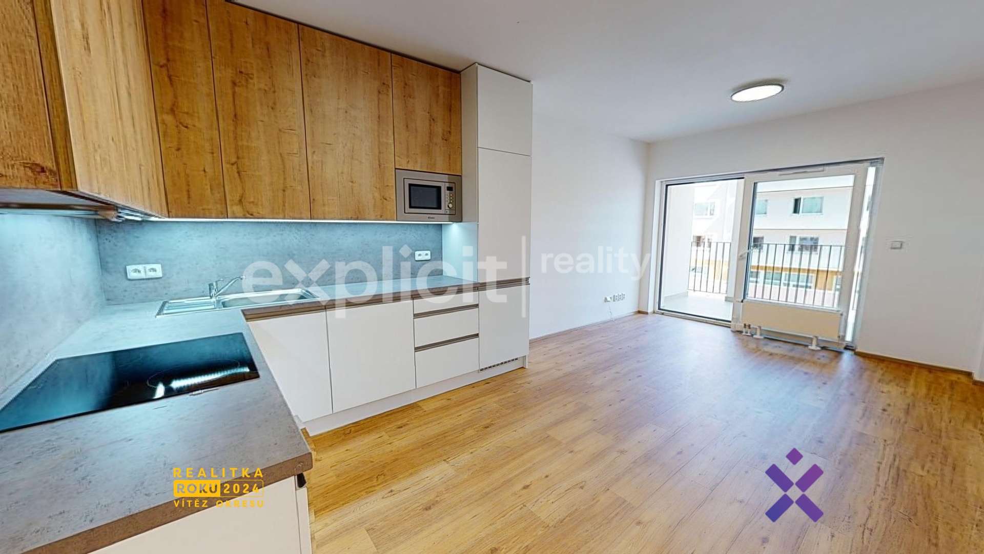 Obývací část je spojená s kuchyňským koutem, který je vybaven kuchyňskou linkou s indukční deskou, horkovzdušnou troubou, mikrovlnkou, myčkou, lednicí s mrazákem a digestoří. Velkou výhodou místnosti je lodžie o velikosti 8 m².