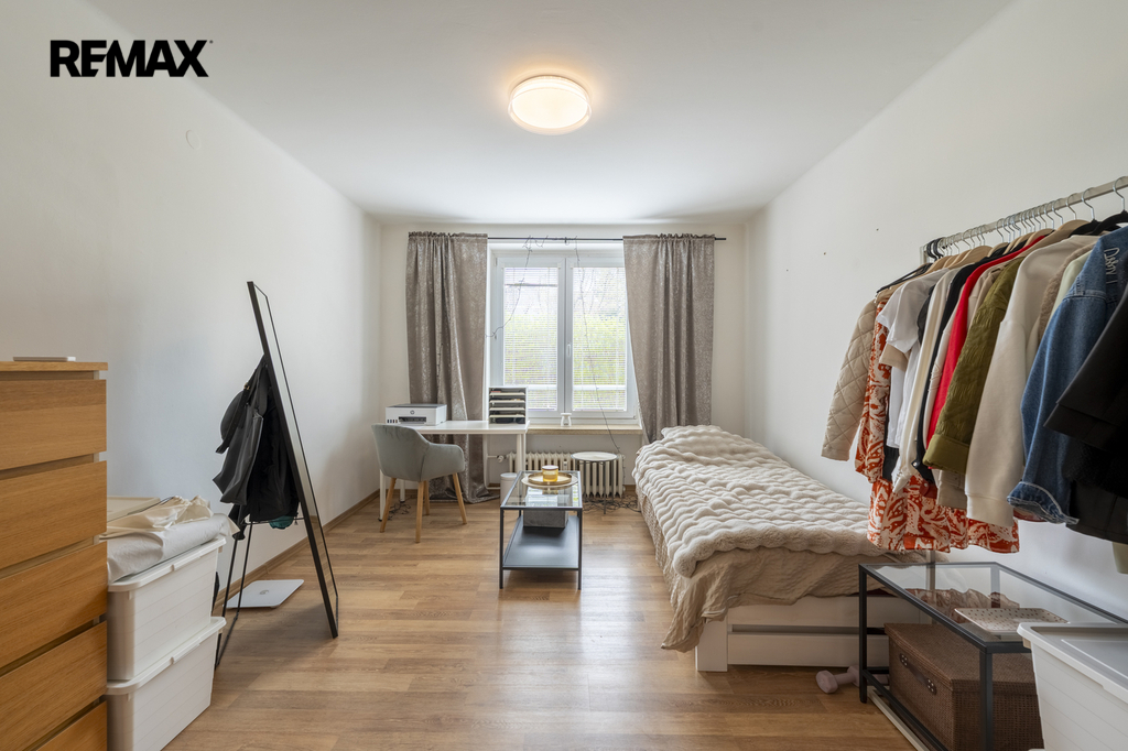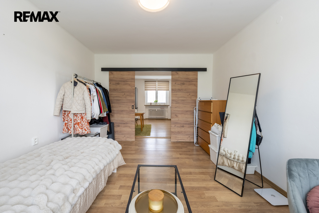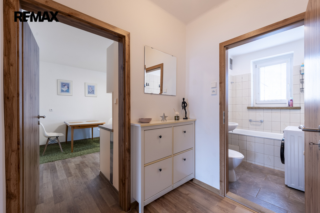 Po vstupu do bytu vás přivítá chodba s dostatkem úložného prostoru. Po pravé straně se nachází koupelna vybavená vanou, toaletou, umyvadlem a pračkou. Naproti koupelně je prostorná a světlá ložnice s dostatkem místa pro úložné řešení.