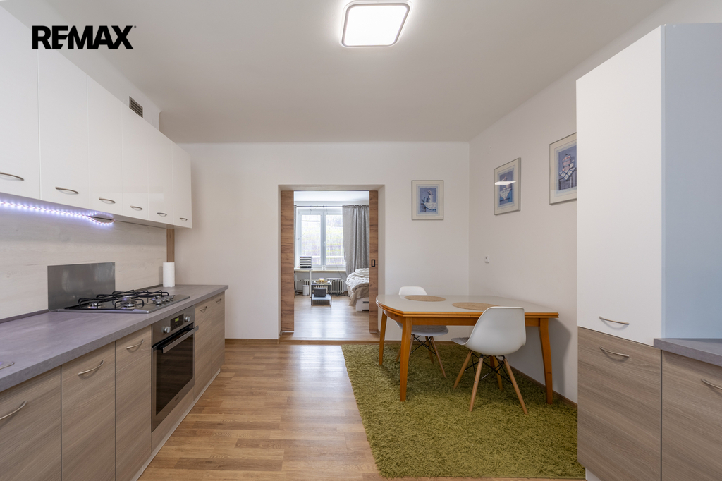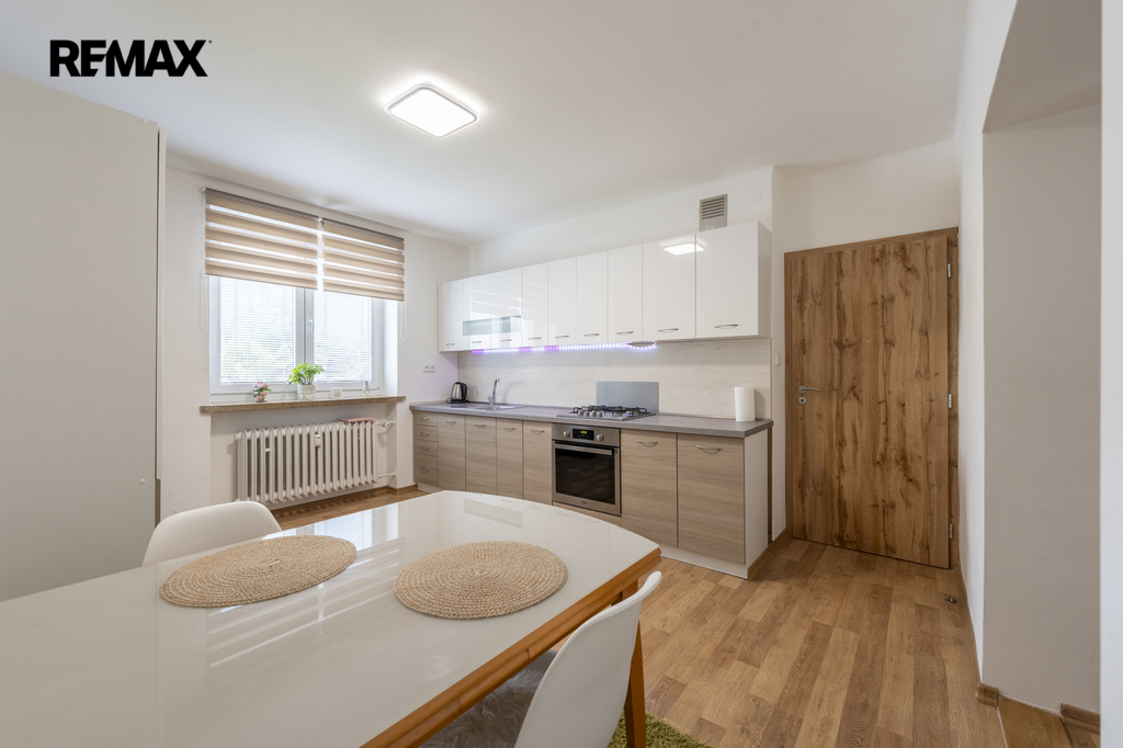 Ze vstupní chodby dále vstupujete do krásné, nově zrekonstruované kuchyně, která nabízí dostatek úložného prostoru, jídelní stůl a je vybavena lednicí s mrazákem. Na kuchyni navazuje obývací pokoj, který může sloužit jako komfortní obytný prostor nebo případně i další ložnice dle vašich potřeb.