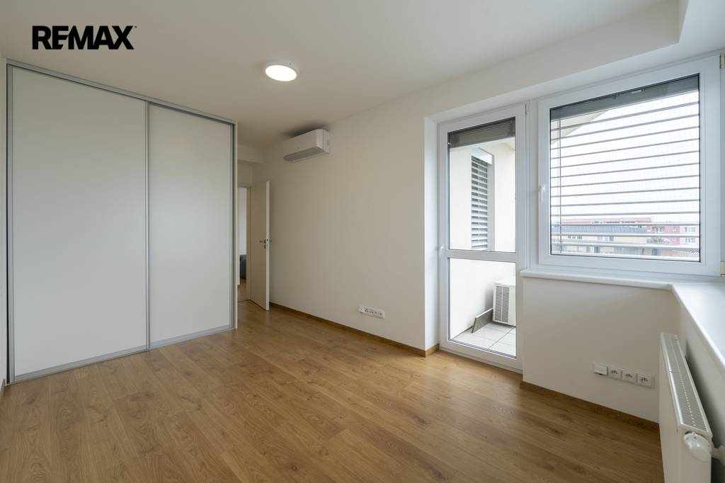 Další místností je ložnice s velkou vestavěnou skříní, která má rovněž vstup na vlastní balkon.