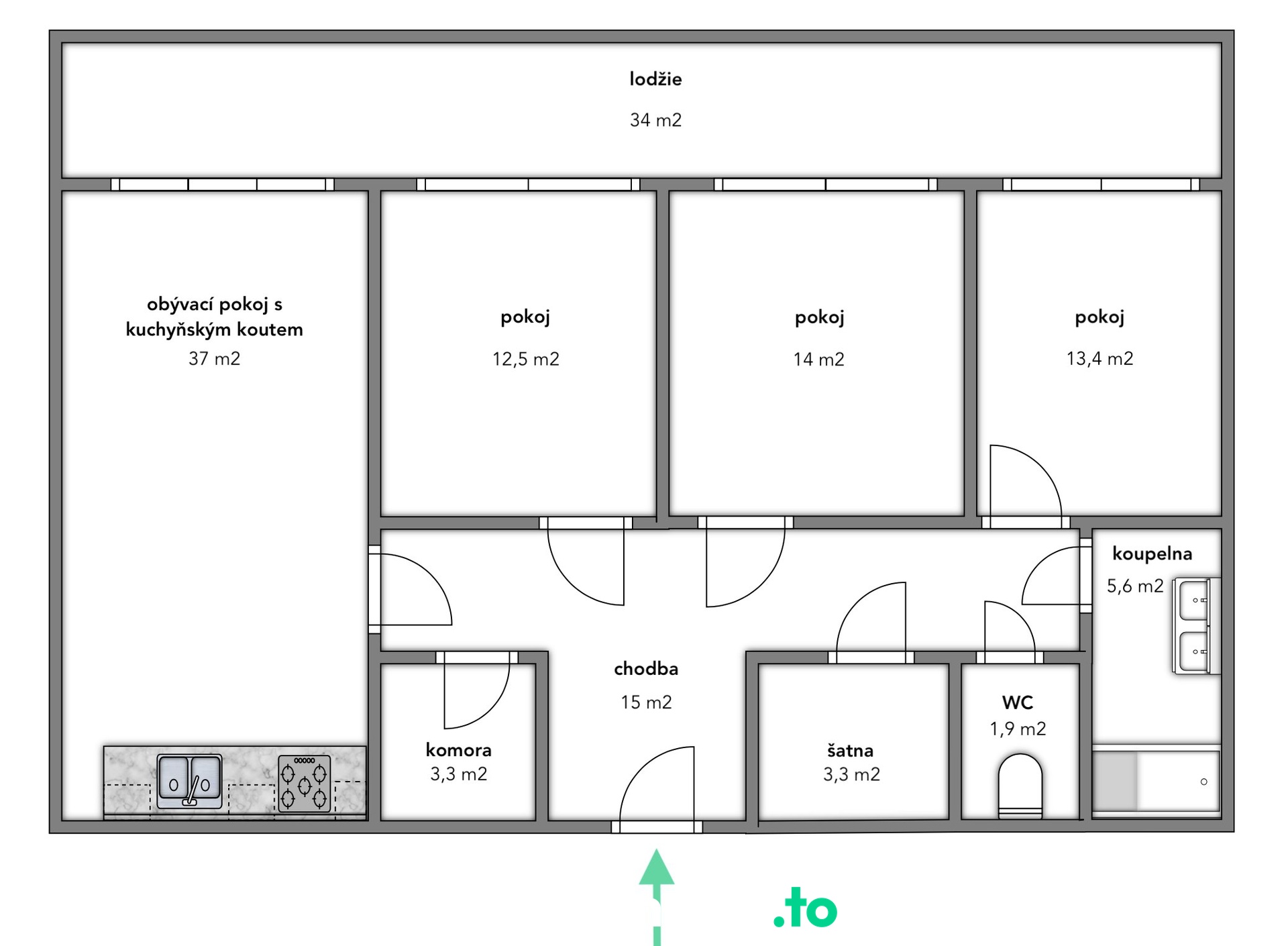 Dispozice: Obývací pokoj s kuchyňským koutem: 37 m² Pokoj: 12,5 m² Pokoj: 14 m² Pokoj: 13,4 m² Koupelna: 5,6 m² Samostatné WC: 1,9 m² Šatna: 3,3 m² Komora: 3,3 m² Chodba: 15 m² Lodžie: 34 m²
