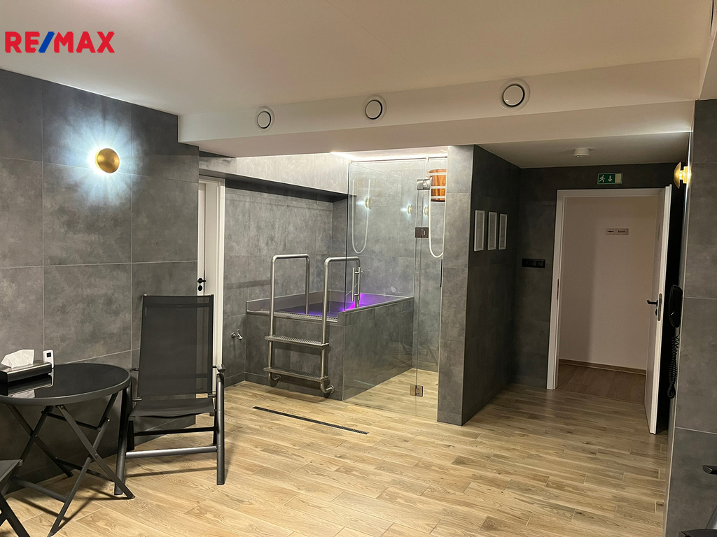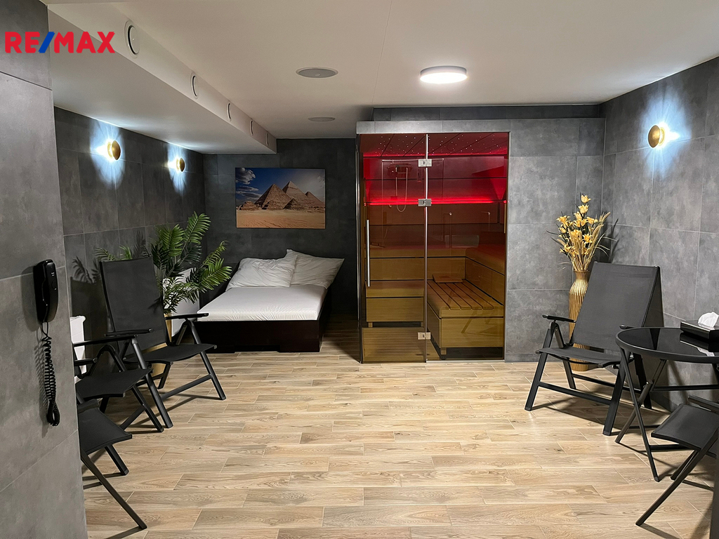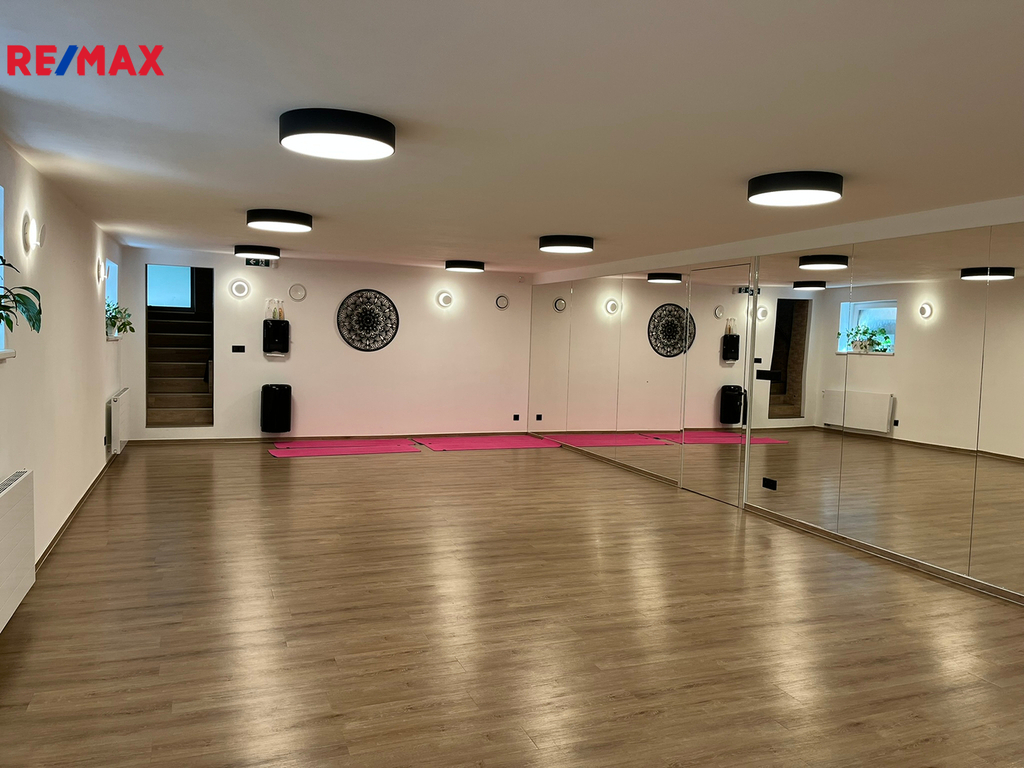 Prostor B – 192 m² (v suterénu / 1. podzemním podlaží): prostorná jógová místnost, kuchyňka, 3 sklady, privátní finská sauna / bio s odpočívárnou, sprchou a WC, chodba s WC, možnost přímého vstupu ze zahrady.