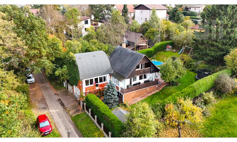 -zabudovaný vyhřívaný bazén s protiproudem, dětské hřiště a posezení s grilem, dřevěný domek na kola, zahradní nářadí a další.
